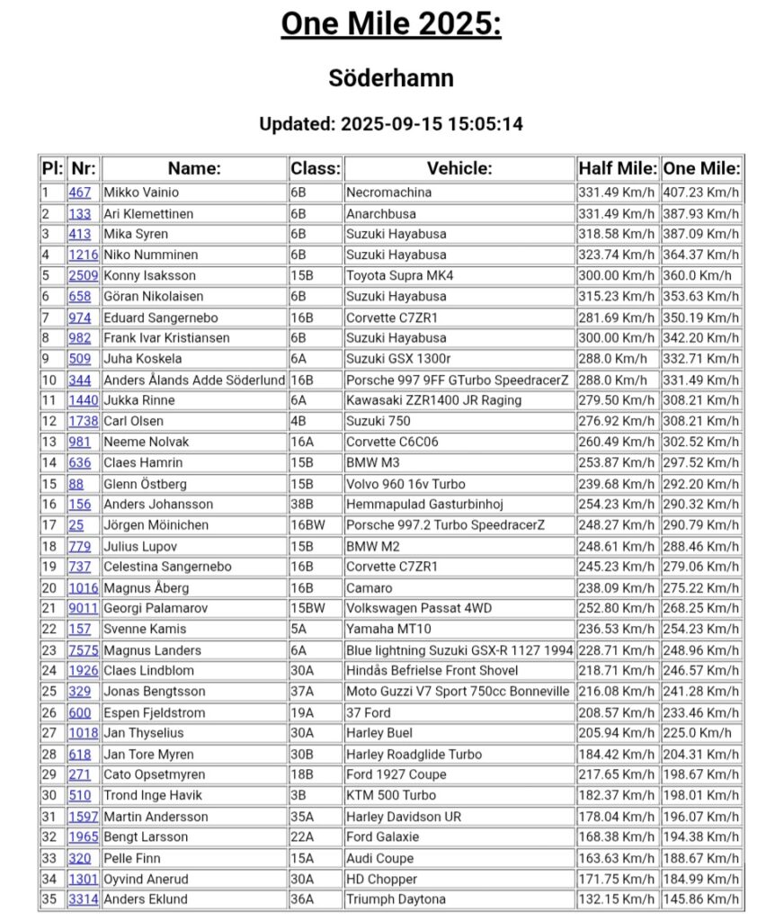 Vi tackar alla team på One Mile för en otroligt bra tävlingsdag, vi klarade vädret presist med 5 timmar körbart väder. Rekord producerades med som bäst 407,23 km/h.